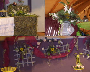"Voilà le domaine que je préfère :  j'ai imaginé ce que je voulais dès le départ dans les grandes lignes : des seaux et des brocs à lait en zinc, une brouette, de la paille, du raphia, du grillage de cages à poules... Ma maman, qui a été fleuriste, a dû se debrouiller avec ces éléments pour me faire de belles compositions (je n'y connais strictement rien en fleurs !)"