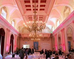 Pour abriter leur réception, Fabio et Eliane ont choisi une immense salle, en accord avec leur thème "bling bling". "Nous avons joué avec les couleurs blanc et fushia pour la décoration. Sous le majestueux lustre de la salle, nous avons disposé des tables et des chaises toutes blanches. Afin de tamiser la lumière, nous avons placé des spots fuchsia au bas de chaque colonne. La salle du buffet a aussi eu droit à une décoration rose bonbon."