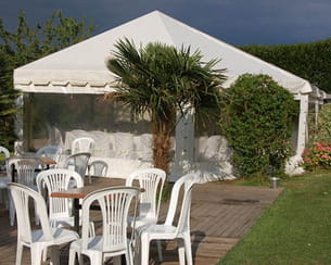 Véronique et Rémy ont donc opté pour cette jolie ferme du Vexin. une tente a été installée dans le jardin de la bâtisse pour recevoir les invités au milieu des arbres et des fleurs.