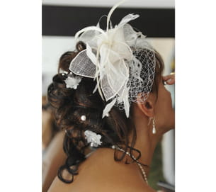 Pour aller avec le style de sa robe de mariée, Anne a opté pour "un joli chignon, quelques boucles, des mèches cuivrées et une petite coiffe rétro avec voilette à plumetis."