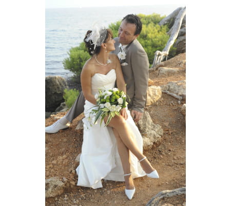 Après s'être dit oui à la mairie, les jeunes mariés ont pris la pose devant un paysage de rêve. Entre Méditerranée et pinède, Anne et Vincent ont brillé d'élégance en robe de mariée glamour et costume trois pièces.