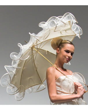 Pour un côté rétro, une ombrelle est parfaite. Voici un modèle signé Suzanne Ermann : l'ombrelle est réalisée en toile de coton et polyester mélangé et est souligné de volutes de tulle, le tout gansé de satin. Et l'avantage, c'est qu'elle fait aussi office de parapluie, car elle est imperméable.