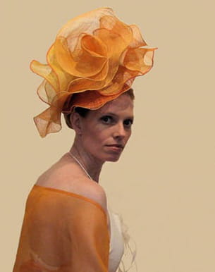 La mariée en blanc, très peu pour vous ? Voici un chapeau aux couleurs chaudes qui porte le doux nom d'anémone. Il est constitué de longs pétales de sisal dans un camaïeu de jaune et d'orange mêlés. L'étole assortie est en organza de soie changeant.