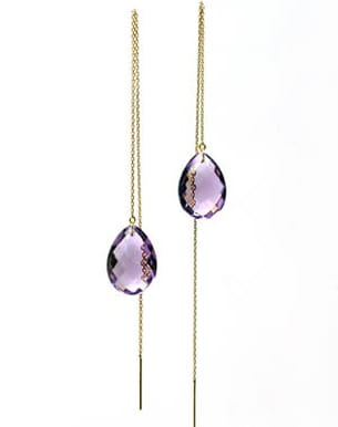 Cette paire de boucles d'oreilles en or jaune présentant une grande poire en améthyste facetée saura souligner tout en délicatesse le visage de la mariée. N'hésitez pas à rappeler cet élément de votre parure par un autre détail couleur, y compris dans la tenue de Monsieur !