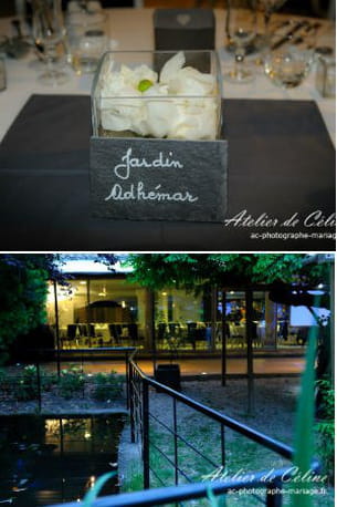 "Pour la déco de table, du simple et de l'efficace grâce à des nappes blanches, des serviettes grises en guise de surnappe, un cube en verre avec des pivoines pour le centre de table, des cailloux "cœur" comme marque-place, des marque-tables en ardoise, des dragées dans des pochons gris très sobres..."