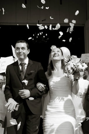 la sortie de l'église avec ballons blancs, pétales de rose, pancartes "Vive les Mariés" tenus par les enfants et les sourires ensoleillés