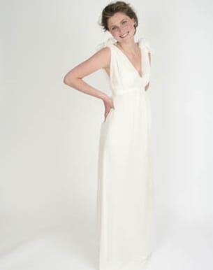 Cette robe en mousseline de soie présente un décolleté osé naturellement drapé qui sublime les silhouettes longilignes. On l'imagine parfaitement accompagnée d'un bouquet de mariée fait d'arums. Un modèle tout en finesse...