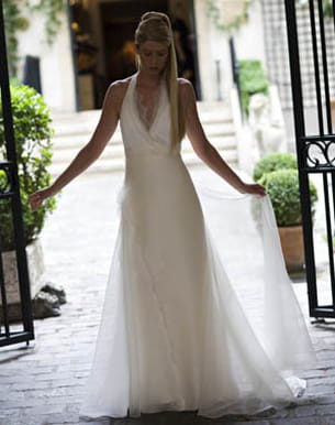 Ce modèle signé Amarildine est une robe en organza brodé de pétales de mousseline. Elle présente un joli dos nu et un décolleté en V brodé de mousseline des plus délicats. Finesse est le maître mot de cette tenue !