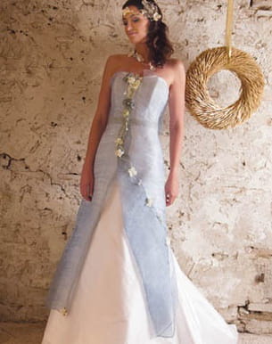 La signature des créations Elsa Gary, ce sont ces matières naturelles et écologiques qu'elle utilise. Ici, la robe Natalia est réalisée en soie sauvage blanche et sisal bleu ciel, avec une jupe à traîne. Le tout est décoré à la main de fleurs en sisal et en tissu.