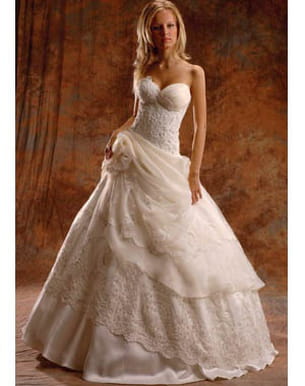Ce modèle imposant correspond parfaitement à l'idée d'un mariage de princesse. Il s'agit d'une robe bustier en satin duchesse et organza de soie, rehaussée de dentelle rebrodée de perles et de strass. Ma-gni-fique !