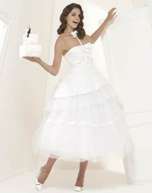 Vous voulez une robe ni longue, ni courte ? Alors voici le modèle Velasquez de la collection Couture de Suzanne Ermann. Cette robe crinoline mi-longue en tulle et satin de soie est rehaussée d'un bustier corseté au jabot piqué de nœuds.
