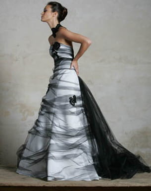 Ce modèle de chez Lambert Créations est une robe drapée de tulle noir orné de dentelle. Elle a la particularité de pourvoir s'adapter à votre thème de mariage, puisque le tulle peut être décliné dans différents coloris.