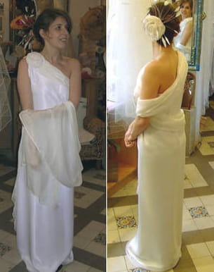 Envie d'une robe de créateur ? Voici un modèle signé Sophie Castagnetti. Cette robe fluide en mousseline de soie présente un décolleté asymétrique, drapé en mousseline. La taille est suggérée par deux pinces. Une fleur piquée sur l'épaule gauche retient l'étole, que l'on peut laisser flotter au gré du vent. On peut la coiffer comme ici d'une grosse fleur en mousseline ou sur l'épaule, agrémentée de fouets de coq.