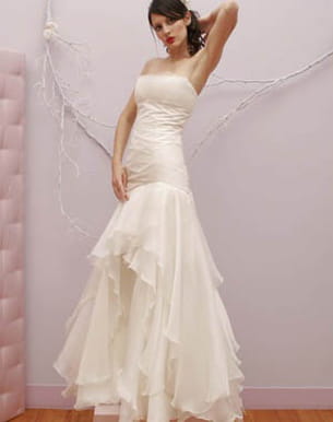 Cette robe signée Marie Viloteau aime à créer des robes 100 % soie (soie sauvage, satin, mousseline, organza). Son modèle Nessy présente une silhouette à taille très basse, soulignée de pans de soie comme autant de petits jupons superposés qui soulignent à merveille la démarche de la mariée.