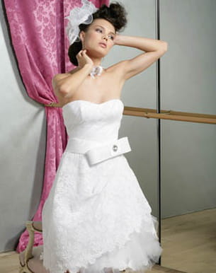 Vous souhaitez deux robes, une pour la mairie, une pour l'église ou la soirée ? Voici une tenue idéale pour la cérémonie civile : il s'agit d'une robe courte réalisée en dentelle, marquée par un joli noeud à la taille.