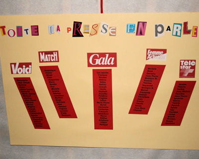 "Le thème du mariage était "people". Le plan de table était donc intitulé "Toute la presse en parle" et donnait, pour chaque table, le nom d'un magazine people. La table des mariés portait le nom Gala, en référence au faire-part."