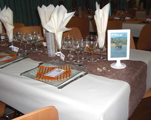 Dans chaque assiette, le menu a été réalisé en forme de carte d'embarquement de la Aile&Aime Cie inventée pour l'occasion (Départ de l'Orient-Express suivi de sa cargaison de valises, Arrêt en gare du sud-ouest, Parfums des routes de France... des plats savamment intitulés !). Le menu détaillé était repris sur des photophores munis d'un code-barre (la date du mariage). Les marque-place ont été réalisés comme les étiquettes que l'on accroche aux valises dans les aéroports. Sur chaque table, une carte postale représentait un pays. Pour parfaire le tout, un chemin de table couleur chocolat et quelques boutons de rose séchés ici et là.