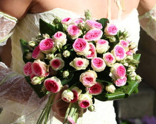 "Le bouquet était composé de roses un peu originales. Elles avaient un cœur fuchsia avec un liseré blanc sur le pourtour. De longues tiges vertes tombaient du bouquet, sur lesquelles la fleuriste avait collé des pétales de roses. J'ai utilisé les mêmes fleurs pour orner ma coiffure."