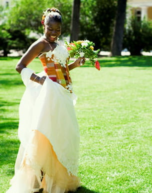 "Ma robe était composée d'un bustier en madras lacé dans le dos et brodé de dentelle rehaussée de strass rouges. Ma jupe était en soie sauvage blanche parsemée également de dentelle et de strass. J'avais des jupons doré et blanc pour donner un peu d'ampleur."