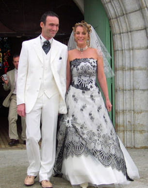 "C'est un bustier et une jupe. Elle est ivoire en soie et satin, recouverte d'un voile de dentelle noire brodée. Derrière, les lacets du bustier sont noirs et du tulle gris descend jusqu'en bas. Malgré la dentelle noire, la robe est très lumineuse."