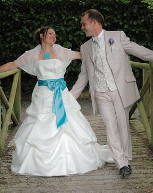 "Ma robe était blanche avec un nœud turquoise, une longue traîne et une jolie boutonniere bleue dans le dos. Elle était parfaite pour moi et collait aux thèmes que l'on avait choisis : la mer et la décoration turquoise."