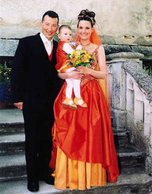 "Je portais un bustier brodé en dentelle aux couleurs jaune, orange, vert. La jupe était en soie sauvage orange, le jupon en soie sauvage jaune/orange. En ce qui concerne mon voile, j'en avais un orange et un autre jaune. Mon bouquet de mariée était dans les mêmes tons avec des rondelles d'oranges séchées et des bâtons de cannelle."