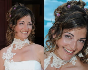 "Une tante et une amie m'ont chouchoutée. Le maquillage était discret avec des nuances de rose. La coiffure était plutôt romantique. Un chignon avec des boucles et des petites boules en fil de fer pour la couleur et l'originalité. J'ai pu faire plusieurs essayages qui m'ont permis de faire évoluer les couleurs et la forme".