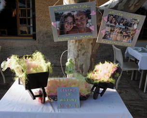 "Nous avons opté pour deux grands cadres avec des photos de nous et sur lequel nous avons tendu des cordelettes. Les invités ont écrit sur des petits cartons et sont venus les épingler sur les cadres. Nous avons perforé les cartons et nous en avons fait un petit livre".