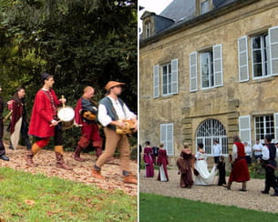 "La cérémonie religieuse s'est déroulée dans la chapelle du château où la réception a eu lieu. Car point de mariage médiéval sans château ! Nous avons donc traversé le parc du château, accompagnés de nos proches, pour rejoindre nos invités et entrer dans la chapelle."