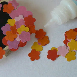 Collez ensuite une à une les "gommettes" obtenues dans un des coins de l'ardoise, en les faisant se chevaucher en un joli tapis de fleurs.