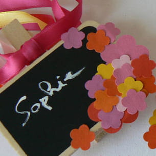 Nouez ensuite un ruban de 40 cm autour de la branche avant de la pince à linge. Il ne vous reste plus qu'à écrire le nom de l'invité sur l'ardoise à l'aide de la craie liquide.