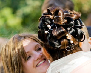 "Je souhaitais une coiffure souple et en volume. Marielle de chez Volte Face Coiffure m'a donc suggéré cette création qui aurait pu avoir l'air classique sans ces mèches noires ajoutées, les perles (toujours) de tailles différentes..."