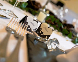 "Les tables étaient placées sous le signe de la "Baroque attitude". Dessus, se trouvaient des chandeliers, du lierre, des orchidées flottantes et des sous-assiettes en ardoise. Pour les porte-noms, j'y suis allée au feeling tout en respectant notre thème baroque."