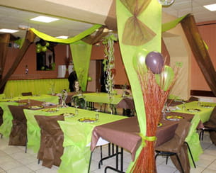 "La décoration était déclinée autour du chocolat et du vert anis. Nous avons mis des tentures aux quatre coins des tables avec des fagots, des housses sur les chaises, des ballons, des déco de table avec des bambous. Et sur le buffet se trouvait une composition avec des pommes et des orchidées." Séverine