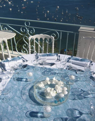 "Le bleu a été choisi par rapport aux couleurs de la villa dans laquelle avait lieu le mariage et de la proximité avec la mer. Des fleurs et des bougies flottantes ont été posées sur les tables pour donner une atmosphère romantique. Le blanc faisait quant à lui référence au mariage."