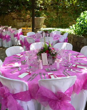 "Pour ce repas en extérieur, l'idée était de contraster avec la densité de la végétation du jardin par la luminosité d'une couleur. Le fuchsia a été retenu pour sa gaieté et sa dynamique. De gros nœuds en intissé fuchsia ont été coordonnés aux surnappes. Les centres de table ont été créés dans les tons de dégradés. Quant aux nœuds de serviettes, ils étaient en organza fuchsia."