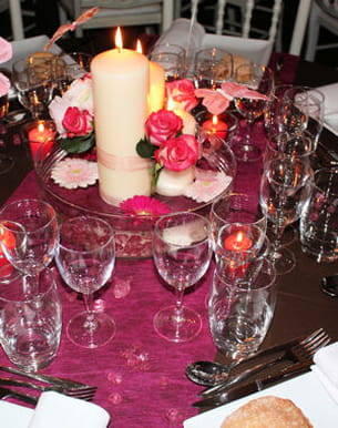"Les rideaux étaient en taffetas rose resserrés avec du lierre et des fleurs roses. L'ensemble de la réception était simplement éclairé à la bougie. Les tables étaient décorées de nappes marron chocolat et de chemins de table sur lesquels étaient éparpillés des diamants roses et blancs. Les centres de tables étaient composés de vasques remplies d'eau et de grosses bougies blanches nouées d'un ruban dans lesquelles étaient piquées des roses roses."