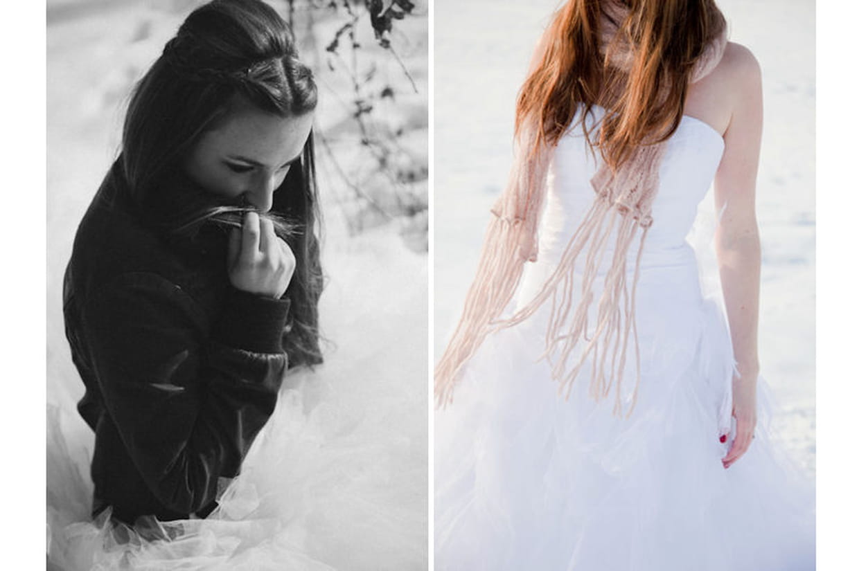 Pour les mariages d'hiver, ce sont les accessoires qui font tout ! Un simple blouson de cuir couvre les épaules de la mariée et une écharpe en vieux rose Promod entoure son cou.