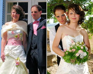 "Il ne m'a pas fallu longtemps pour trouver ma robe de mariée. Après des essayages dans une première boutique, je me suis rendue dans celle d'Elsa Gary. Deux essayages plus tard, j'avais déjà deux coups de cœur. Inutile d'aller plus loin. Mon choix s'est donc porté sur cette robe aux tons pastel très originale. Jérôme portait un costume trois pièces noir accompagné d'une lavallière rose reprenant les couleurs de ma robe."