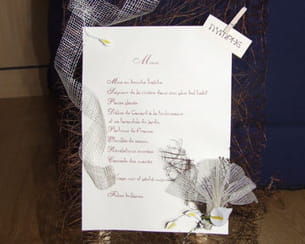 "J'ai choisi de présenter les menus sur des chevalets. J'en ai réalisé dix différents pour chaque table avec des éléments de décoration naturels. Pour les compositions de table, j'ai choisi des roses blanches et des arums. J'ai donné à chaque table des noms de nuances de marron et d'écru : caramel, vanille, nymphe, champagne, brune, sépia, ivoire, lin, chocolat, noisette."