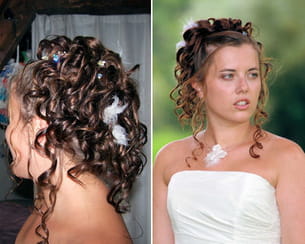 "J'ai montré la photo de la robe à ma coiffeuse, je lui ai expliqué que je voulais quelque chose d'assez simple et je l'ai laissée faire. Ma coiffeuse l'a fait en un peu plus de 2 heures. Je trouvais le résultat super joli ! Les plumes et les perles ressortaient bien. A 6 heures du matin, ça tenait encore. Seules les boucles s'étaient un peu détendues."