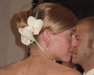 "J'ai choisi cette coiffure sur un modèle et elle s'accordait parfaitement avec la robe aux lignes sobres et au bustier orné de petites feuilles vertes. Le seul essai réalisé dans un petit salon de Saint-Martin de Boscherville en Seine-Maritime a été concluant. La coiffure finale le jour J était parfaite, avec en prime l'émotion de la coiffeuse."