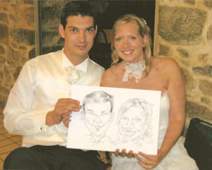 Les mariés tenant leur caricature © DR