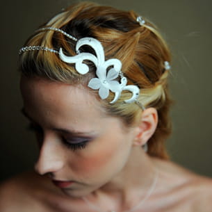 Pour accessoiriser votre coiffure de mariée, nous avons craqué pour ce headband fait main, avec des perles de culture, des cristaux Swarovski et de délicates fleurs de soie. A la fois romantique et bucolique, ce serre-tête a tout pour plaire ! Il pourra se porter aussi bien sur des cheveux lâchés et ondulés que sur une coiffure plus sophistiquée.