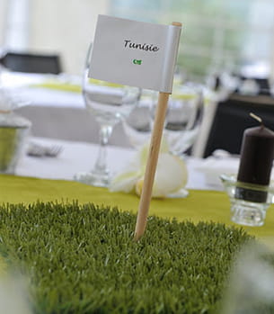 "Chaque table porte le nom d'une destination que nous avions visitée tous les deux. C'est la grand-mère de Mathieu qui coud les nappes, en tissu vert. Les centres sont réalisés, à la main, à partir d'un carré d'herbe synthétique sur lequel est planté un drapeau (comme sur un green).