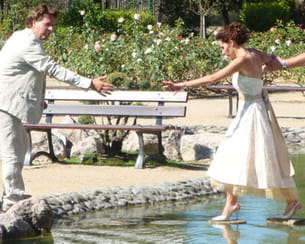 "La cérémonie civile se terminant à 16h, n'ayant pas de cérémonie religieuse, nous sommes tous allés faire des photos dans un superbe parc. Le photographe-copain avait repéré une "petite île" où se trouvait un banc et a voulu que nous y allions avec nos témoins pour prendre 2 ou 3 clichés. La traversée fut romantique et périlleuse car je n'avais pas moins de 9 cm de talons avec lesquels j'ai dû marcher sur des pierres rondes au ras de l'eau ! Je dois avouer que je n'étais pas très rassurée, je craignais de glisser. Mais au final, cela donne de merveilleux souvenirs et de superbes photos."