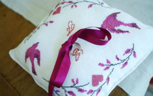 "Cousu main et joliment brodé, le coussin des alliances est confectionné entièrement par ma marraine. Un loisir qu'elle a voulu créatif !"
