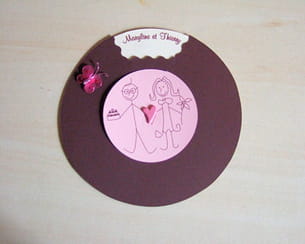Marylin a entièrement fabriqué les faire-part elle-même (au total plus de 200). On y retrouve les couleurs du thème : rose pâle et chocolat ainsi qu'un dessin naïf tout à fait adorable. Inspiré par la forme du vinyle, ces faire-part ont sans aucun doute remporté l'unanimité auprès des invités !