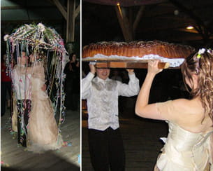 "Enfin, nous avons ouvert le bal sur une chanson d'Olivia Ruiz : "J'envoie valser". L'orchestre a su mettre tout de suite l'ambiance. Nous avons bien entendu fait la danse traditionnelle de la brioche vendéenne, qui consiste à tenir la brioche à deux personnes sur un "brancard" tandis que les autres personnes font une farandole autour. Ensuite, l'orchestre nous a demandé de monter sur scène pour interpréter une chanson sur laquelle ils nous accompagnaient. Nous n'étions pas du tout au courant et le marié n'avait plus de voix, mais c'était une expérience très amusante. Enfin le bal s'est terminé tout en romance avec la danse du parapluie... Que d'émotions ! "