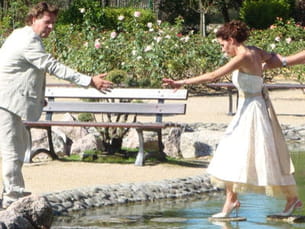 Elle est Parisienne, lui originaire de Dunkerque... le thème était lancé pour ces deux tourtereaux qui se sont rencontrés sur Internet. Pour immortaliser leur amour, ils ont pu compter sur un ami photographe qui avait repéré un parc et surtout une petite île. Pour ce cliché, la mariée ne s'est pas ménagée puisqu'elle a dû marcher sur des pierres rondes, au ras de l'eau, avec ses talons de 9 cm !